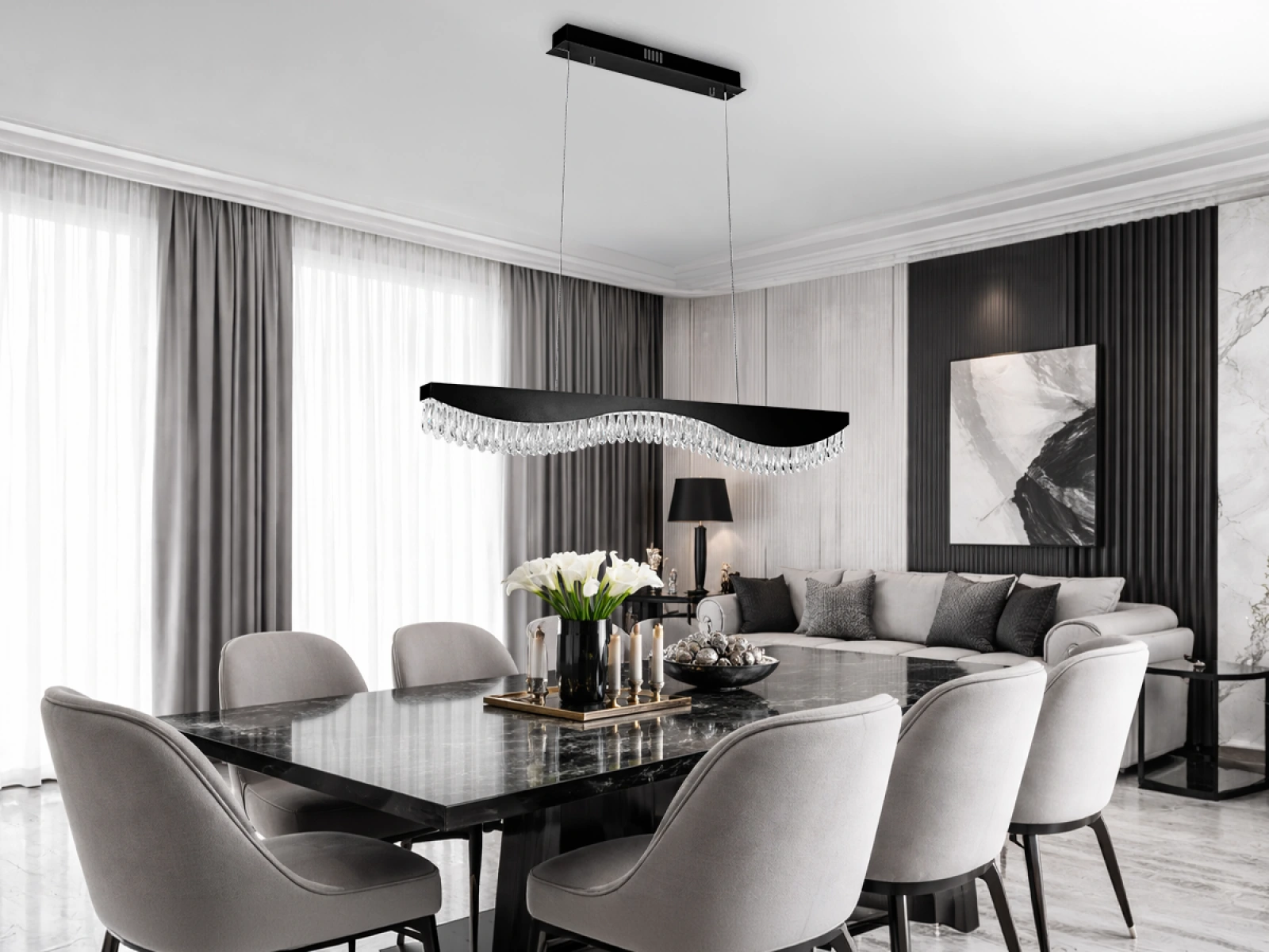 Die Leuchte ist aus hochwertigem Edelstahl in Premiumausführung gefertigt und mit präzisionsgeschliffenen Kristallen versehen, die die Reflexion und Brechung des Lichts verstärken. Die verwendete Verarbeitungstechnologie gewährleistet die langfristige Stabilität des Materials und die Erhaltung des ästhetischen Erscheinungsbildes.