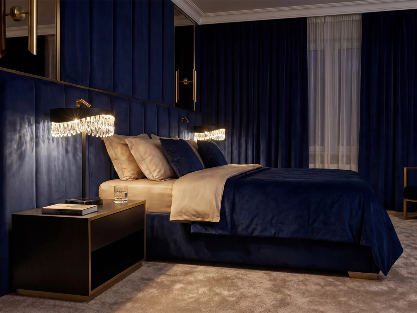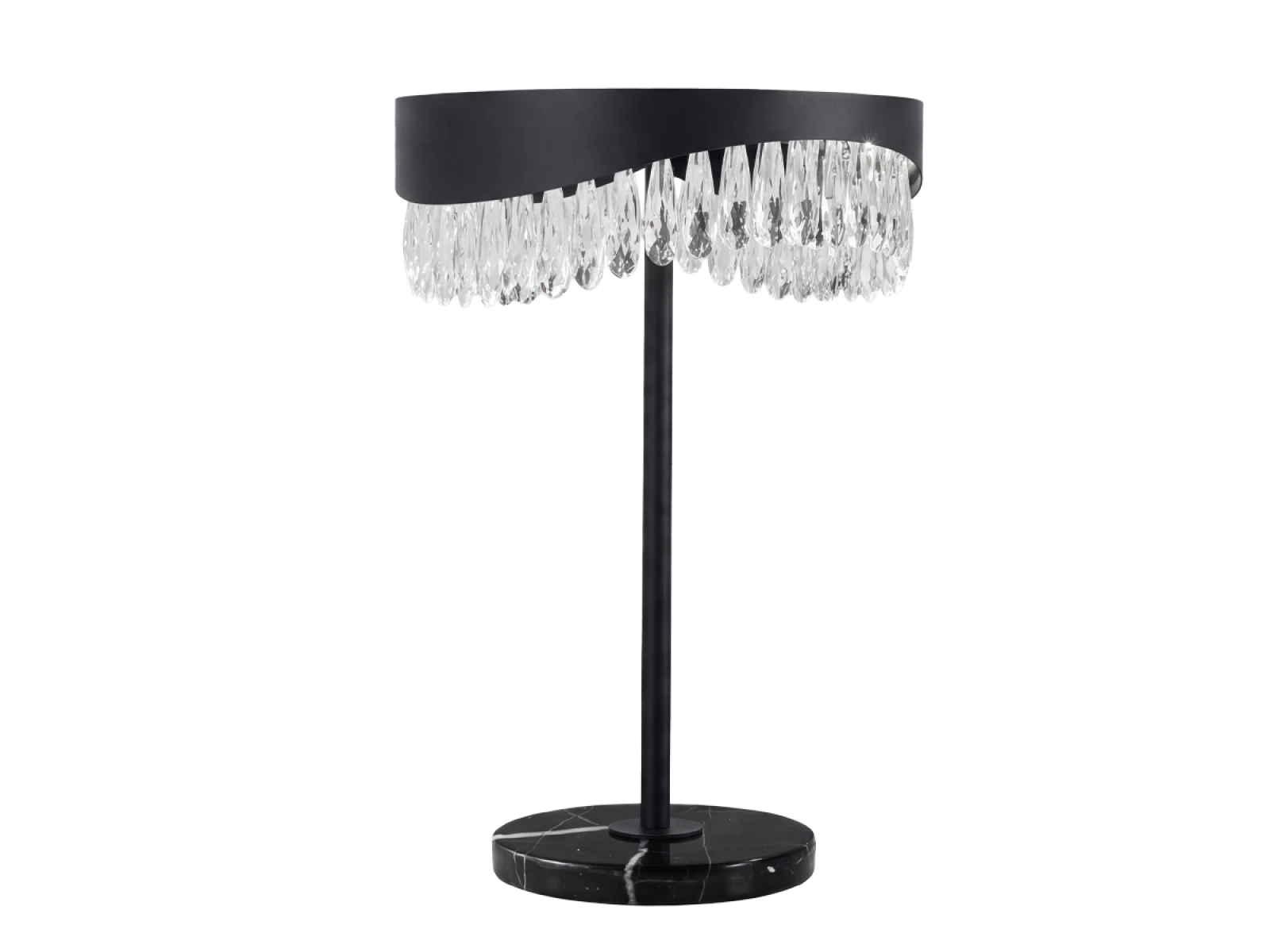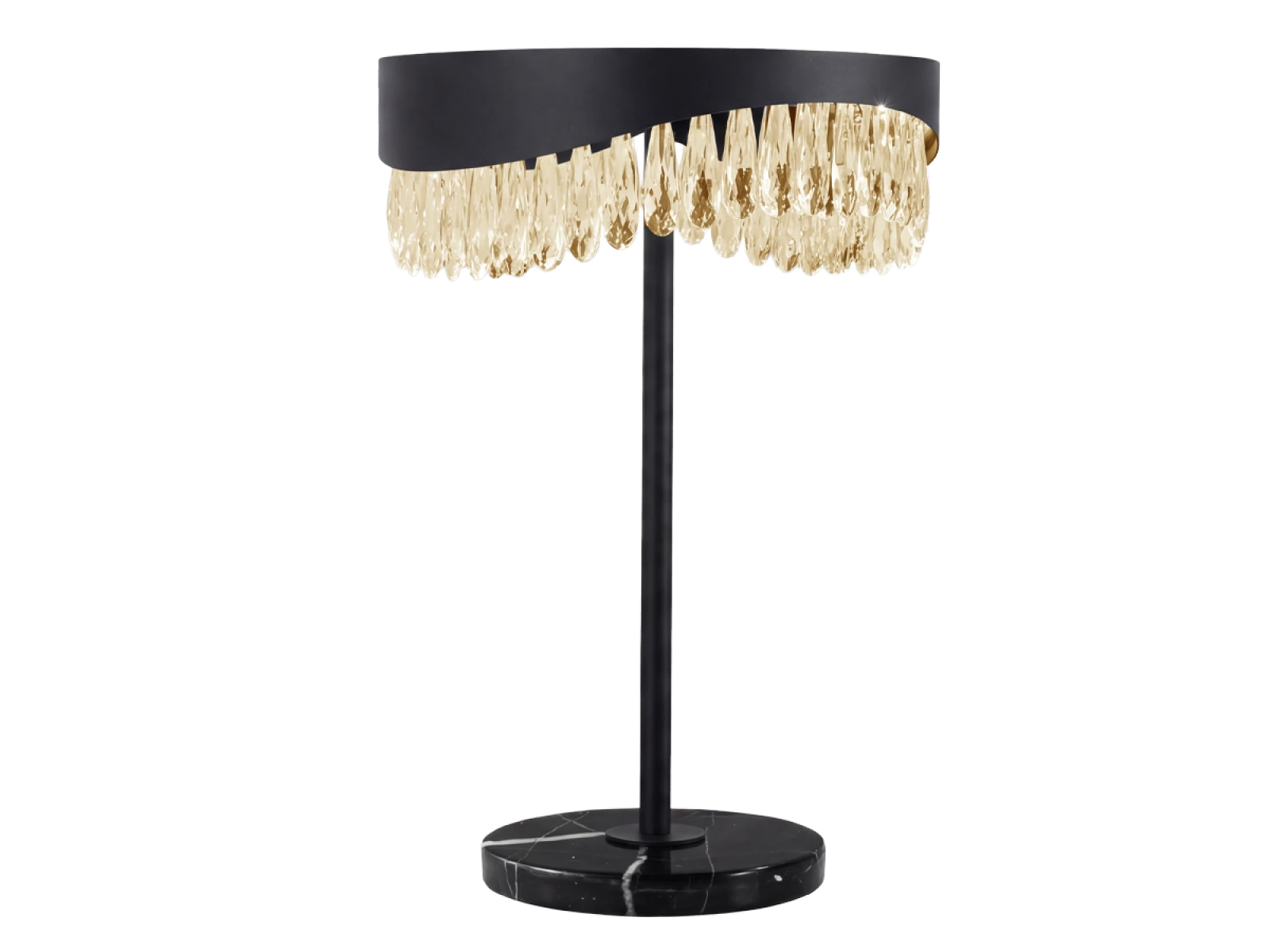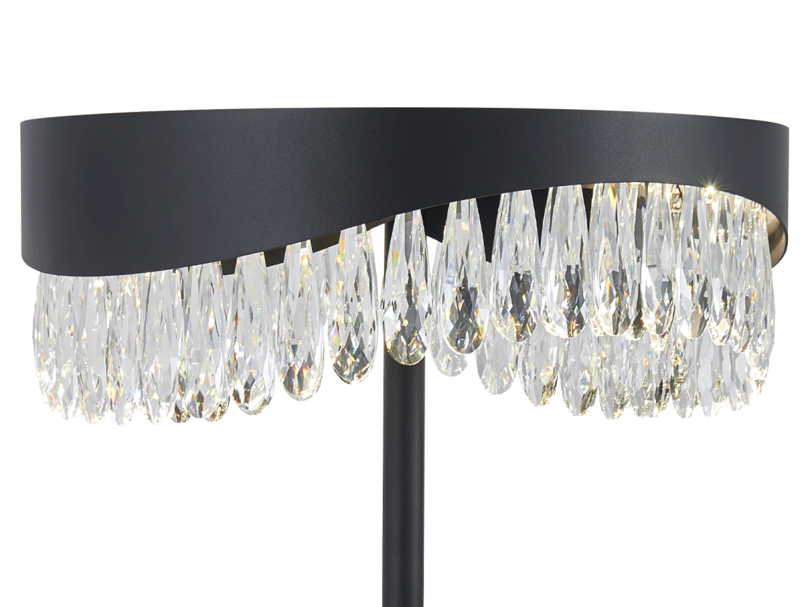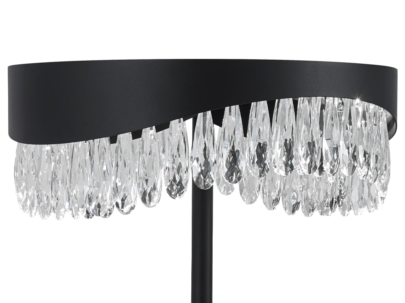 Der Sockel der Leuchte besteht aus hochwertig veredeltem Edelstahl, ergänzt durch präzise geschliffene Kristalle, die den Effekt der Lichtreflexion verstärken. Dank der hochwertigen Verarbeitung behält das Material sowohl seine Stabilität als auch sein Aussehen.
