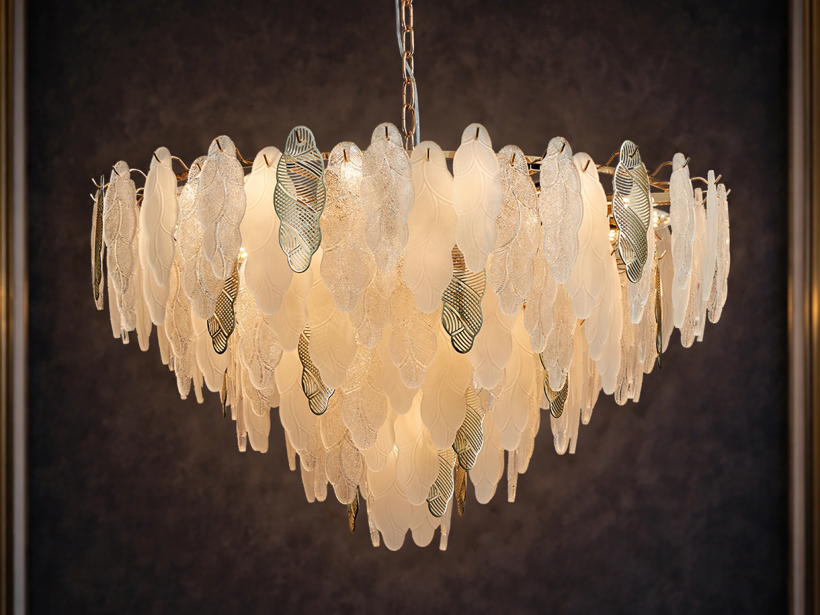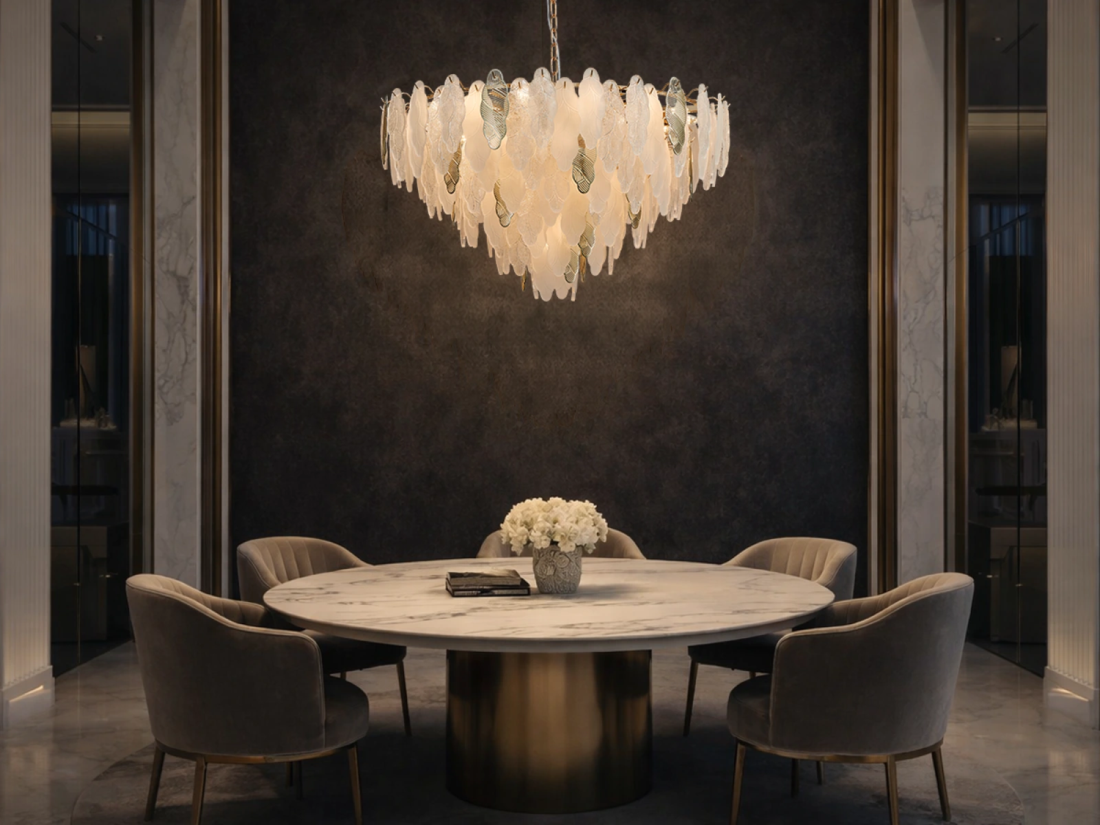 Die feine Struktur der Glaselemente in Kombination mit dekorativen Metalldetails unterstreicht den luxuriösen und anspruchsvollen Charakter dieser Kollektion.