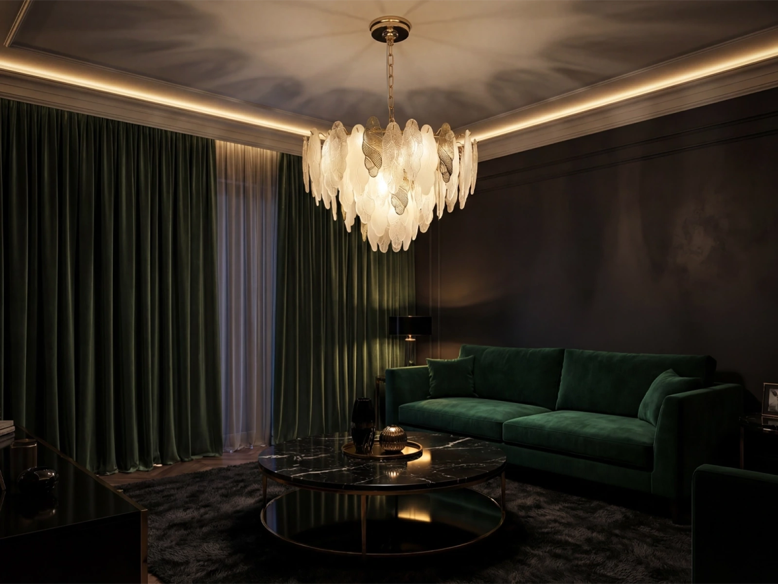 Die Pendelleuchte CHOREO von VIZARDI ist eine elegante Designleuchte mit einem ausgeprägten dekorativen Charakter. Die präzise Anordnung der einzelnen Elemente schafft eine harmonische Komposition mit einzigartiger Lichtwirkung und setzt einen markanten optischen Akzent im Raum. Die Leuchte eignet sich für Wohnzimmer, Esszimmer, Schlafzimmer und repräsentative Innenräume.