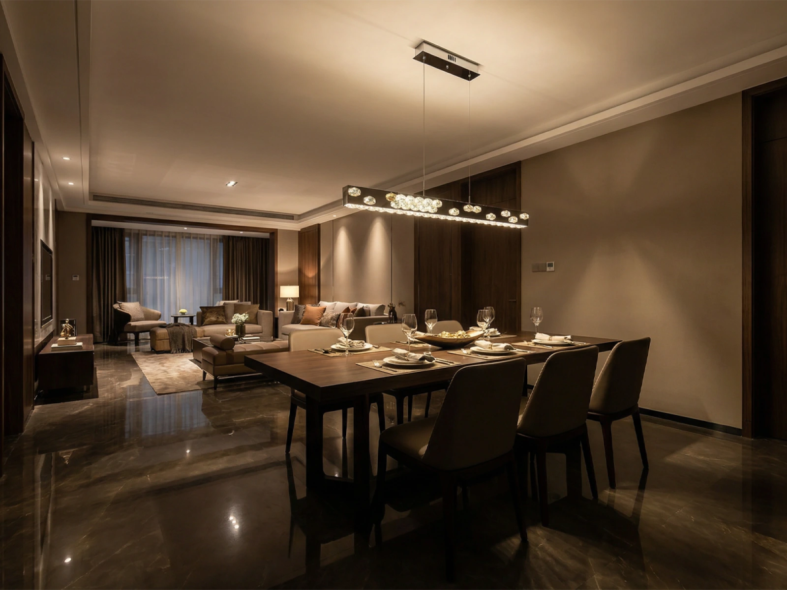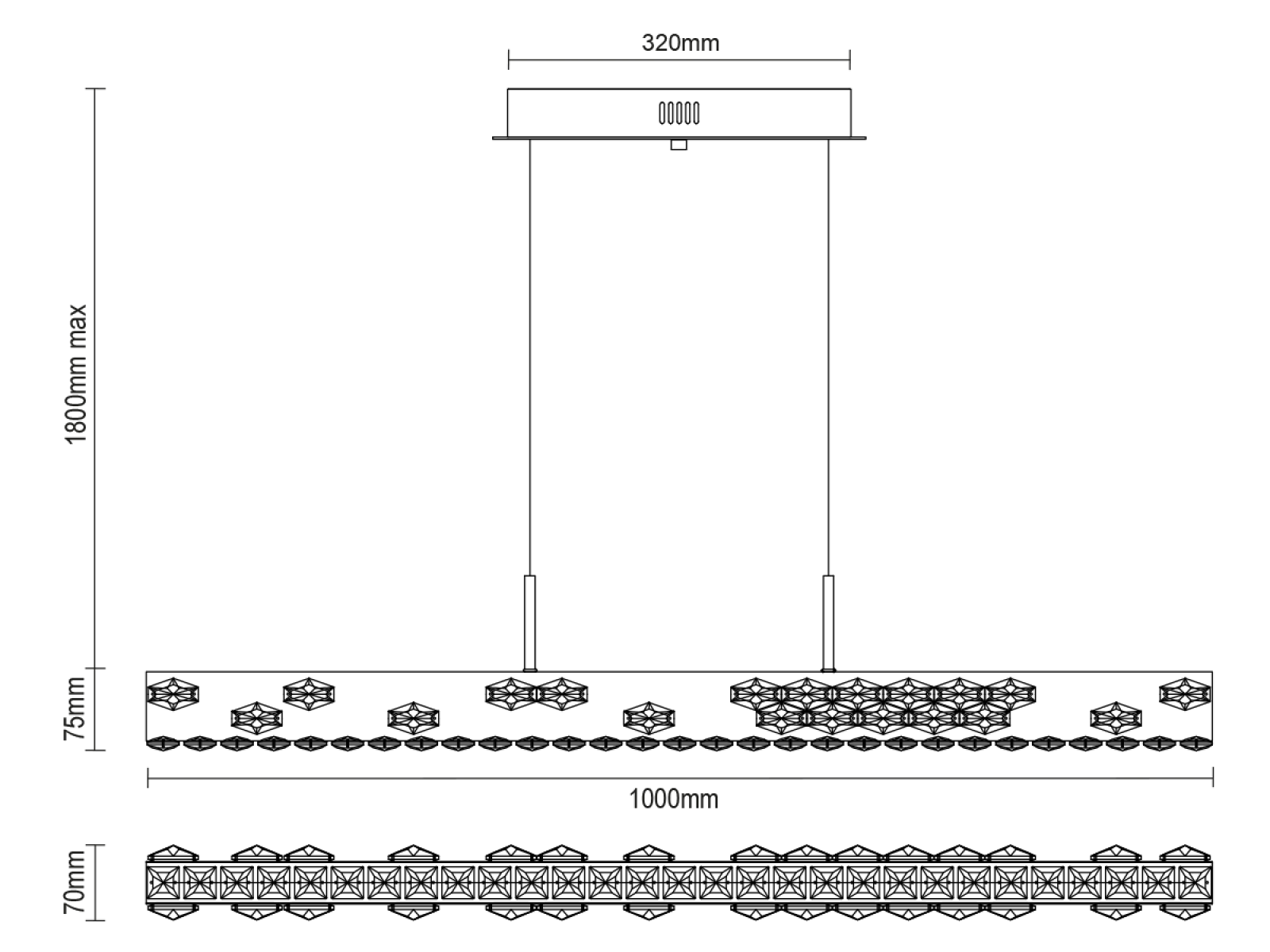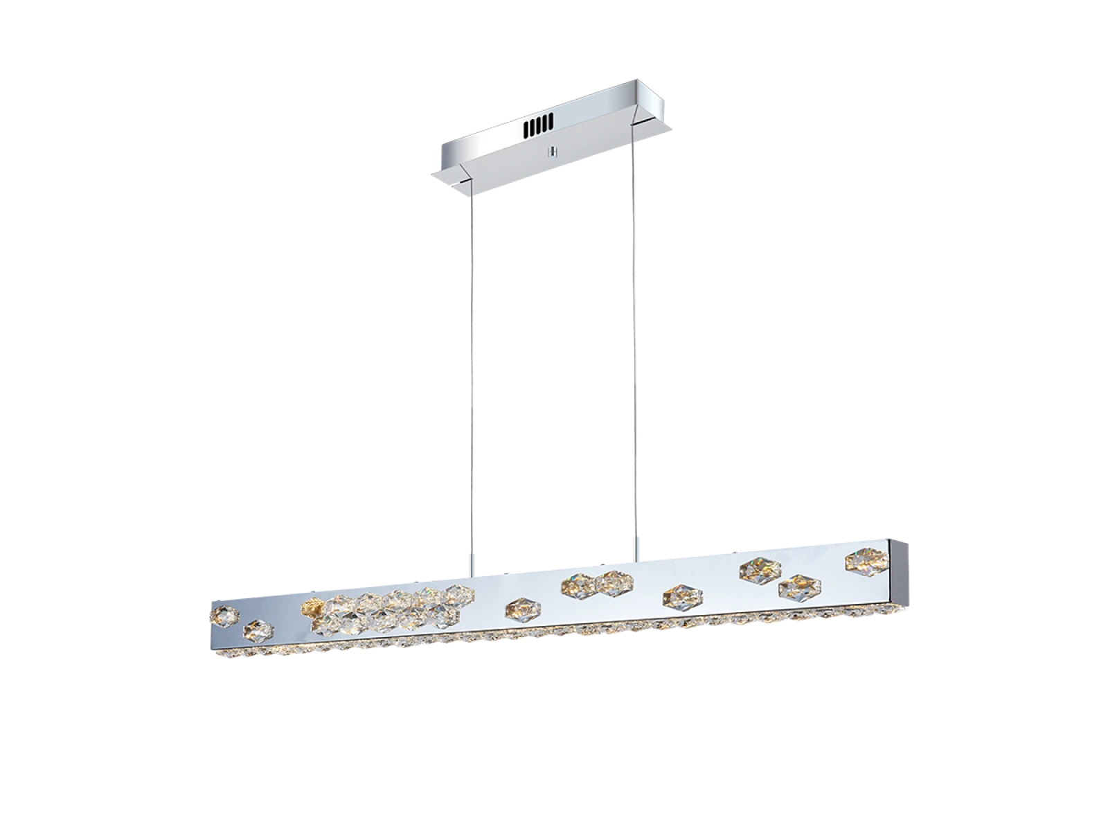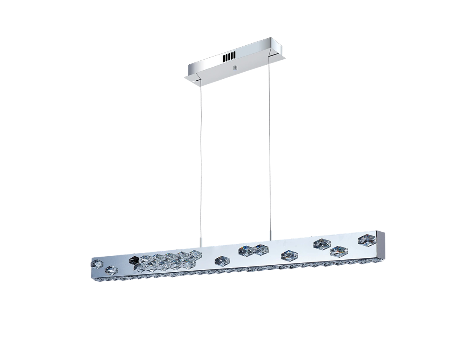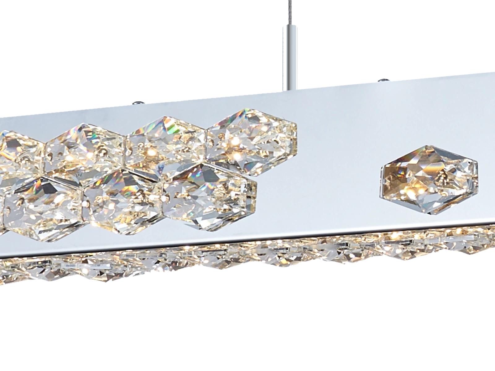Die Leuchte ist aus hochwertigem, verchromtem Edelstahl gefertigt und wird durch präzise geschliffene Kristalle ergänzt, die sowohl die Reflexion als auch die Brechung des Lichts betonen. Die moderne Verarbeitungstechnologie garantiert eine langfristige Stabilität des Materials und die Erhaltung des ästhetischen Erscheinungsbildes.