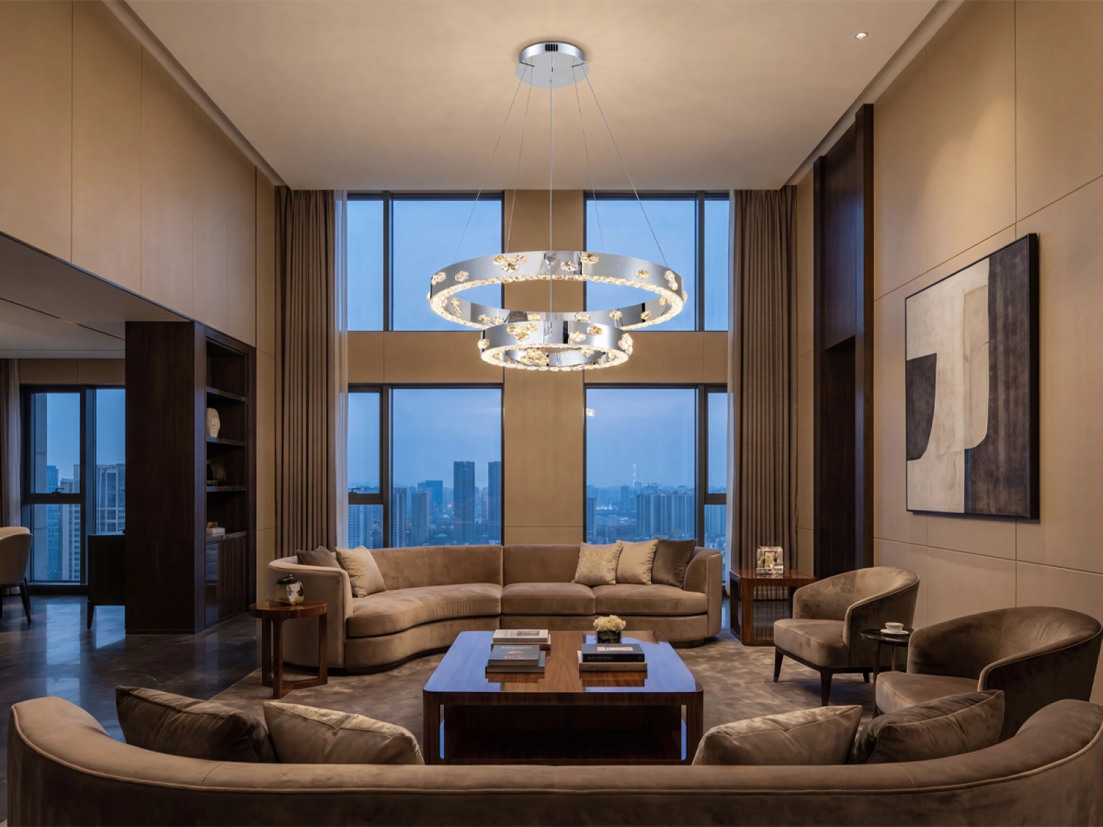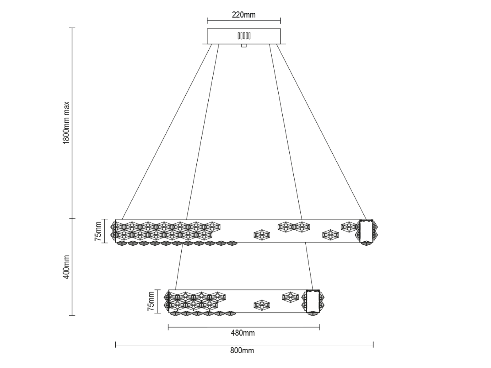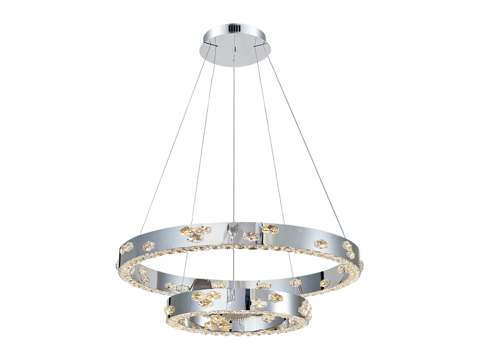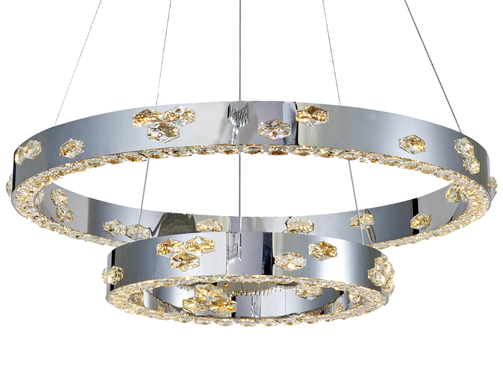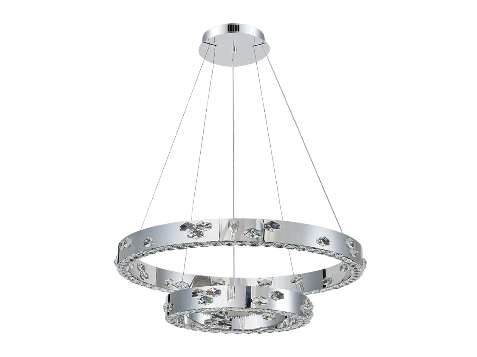 Die Leuchte ist aus hochwertigem verchromtem Edelstahl gefertigt und wird durch geschliffene Kristalle ergänzt, die die Lichtreflexion und -brechung verstärken. Die verwendete Produktionstechnologie garantiert die Stabilität des Materials und die langfristige Erhaltung seiner visuellen Eigenschaften.