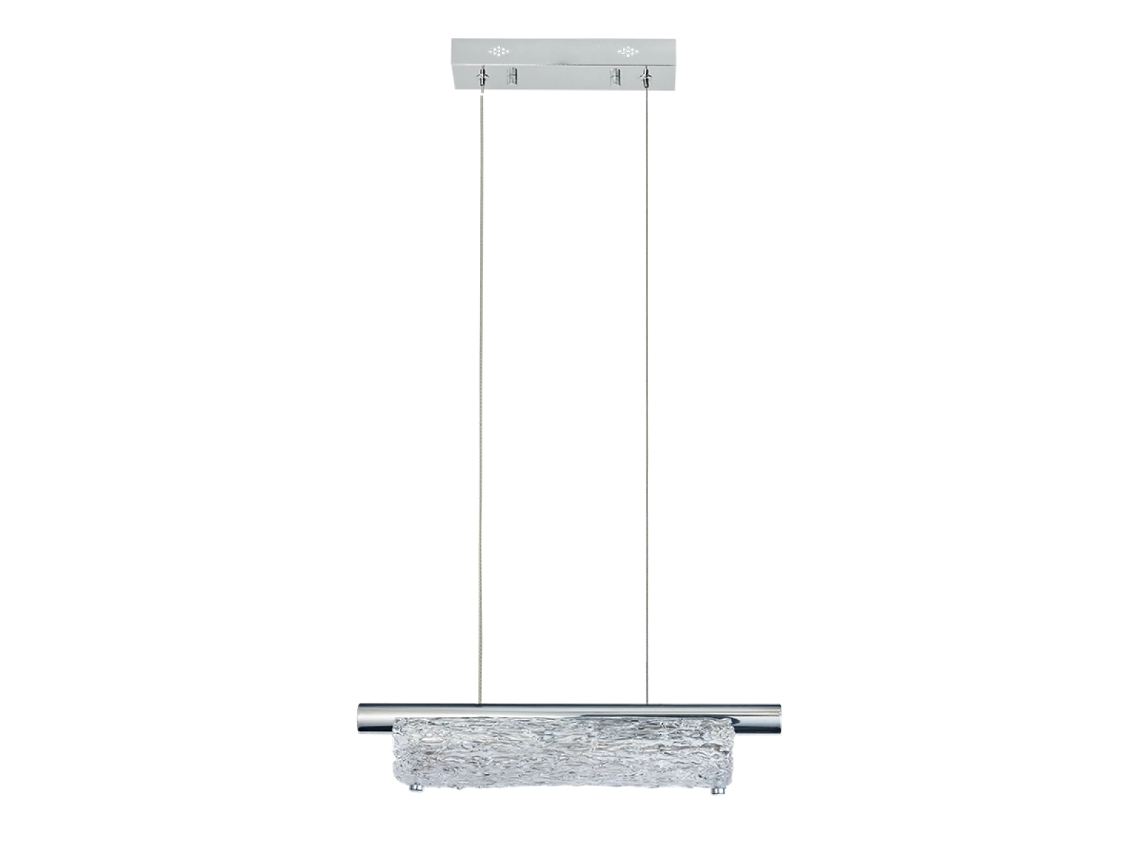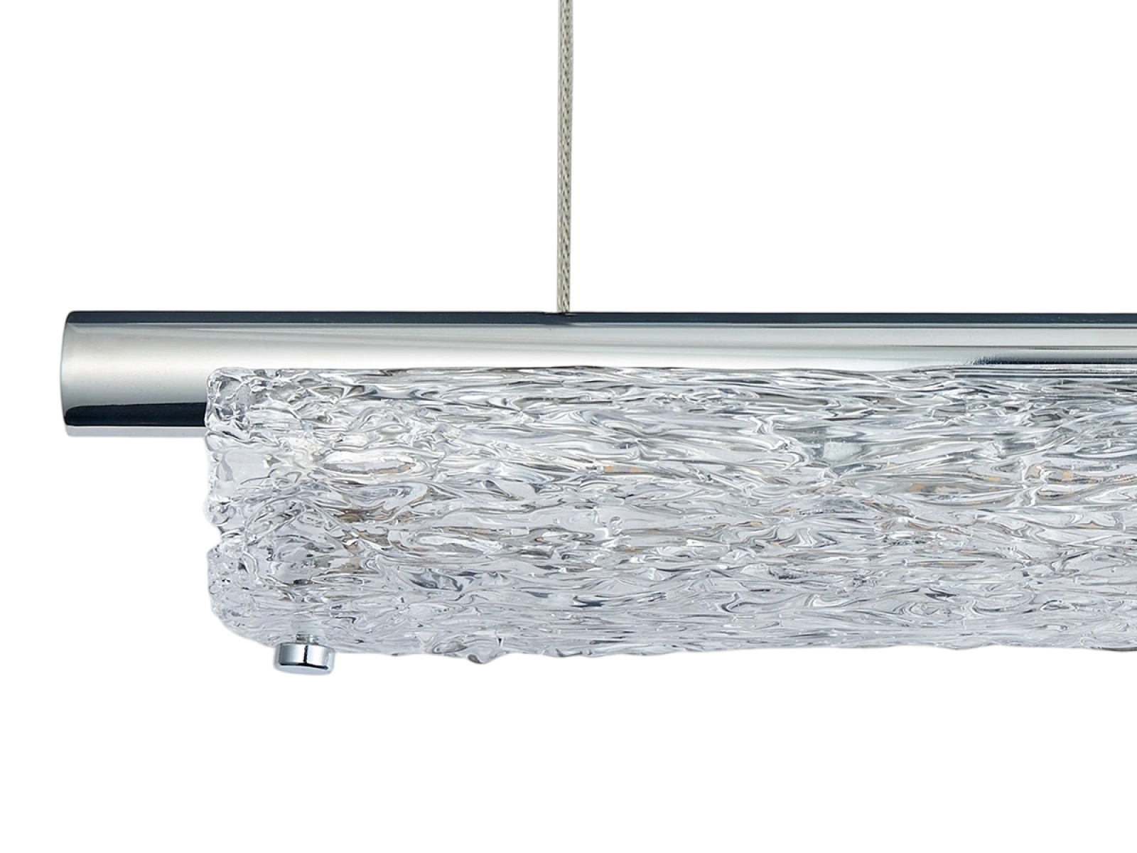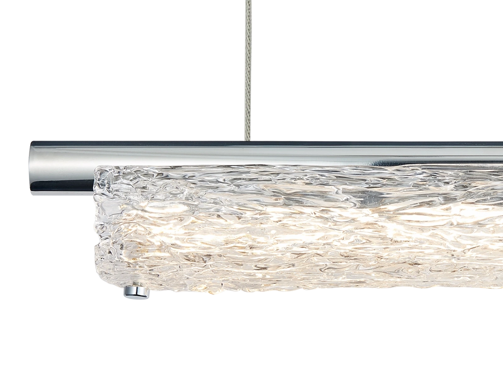 Die Leuchte ist aus hochwertigem, verchromtem Edelstahl gefertigt, der eine lange Lebensdauer, Stabilität und ein luxuriöses Aussehen garantiert. Die Glaselemente mit einer strukturierten, rindenähnlichen Oberfläche sorgen für eine gleichmäßige und angenehme Lichtstreuung.