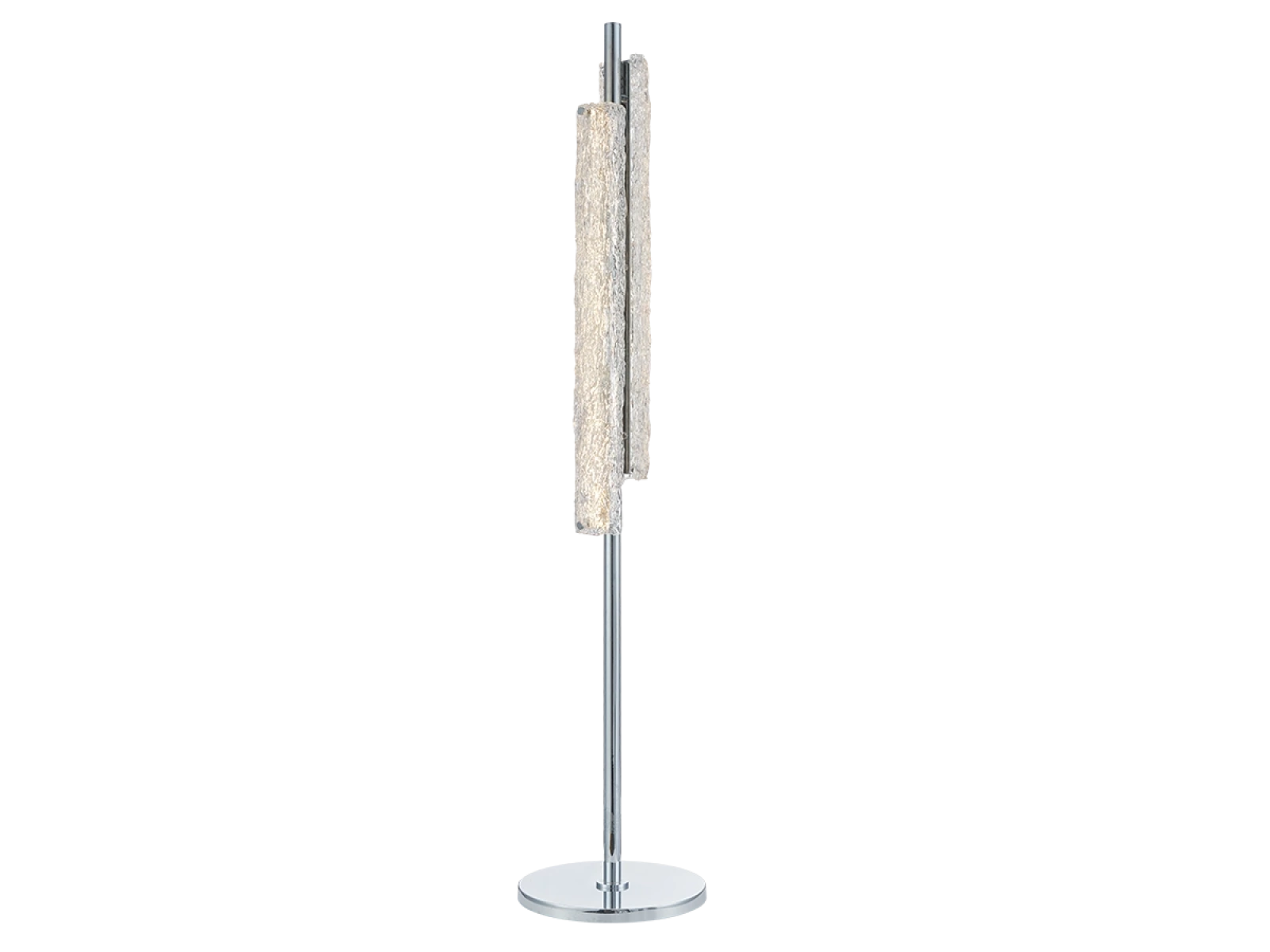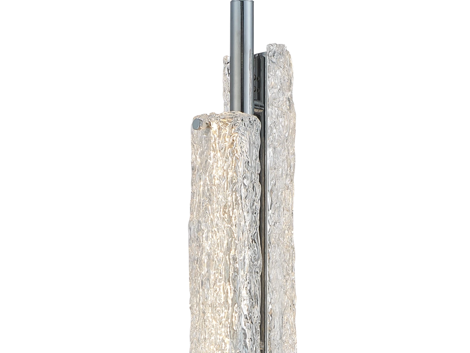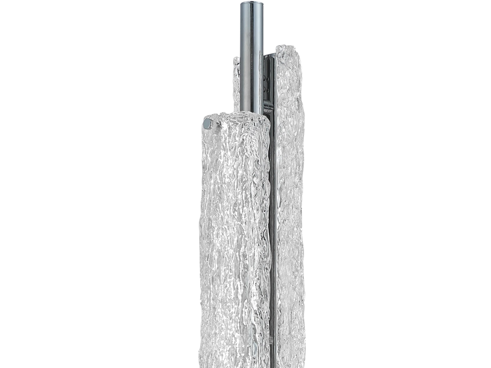 Die Leuchte ist aus hochwertigem, verchromtem Edelstahl gefertigt, was für eine lange Lebensdauer, Stabilität und ein luxuriöses Erscheinungsbild sorgt. Die Glaselemente mit einer strukturierten , rindenähnlichen Oberfläche sorgen für eine gleichmäßige und angenehme Lichtstreuung.