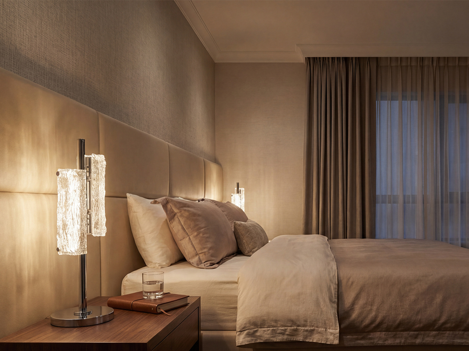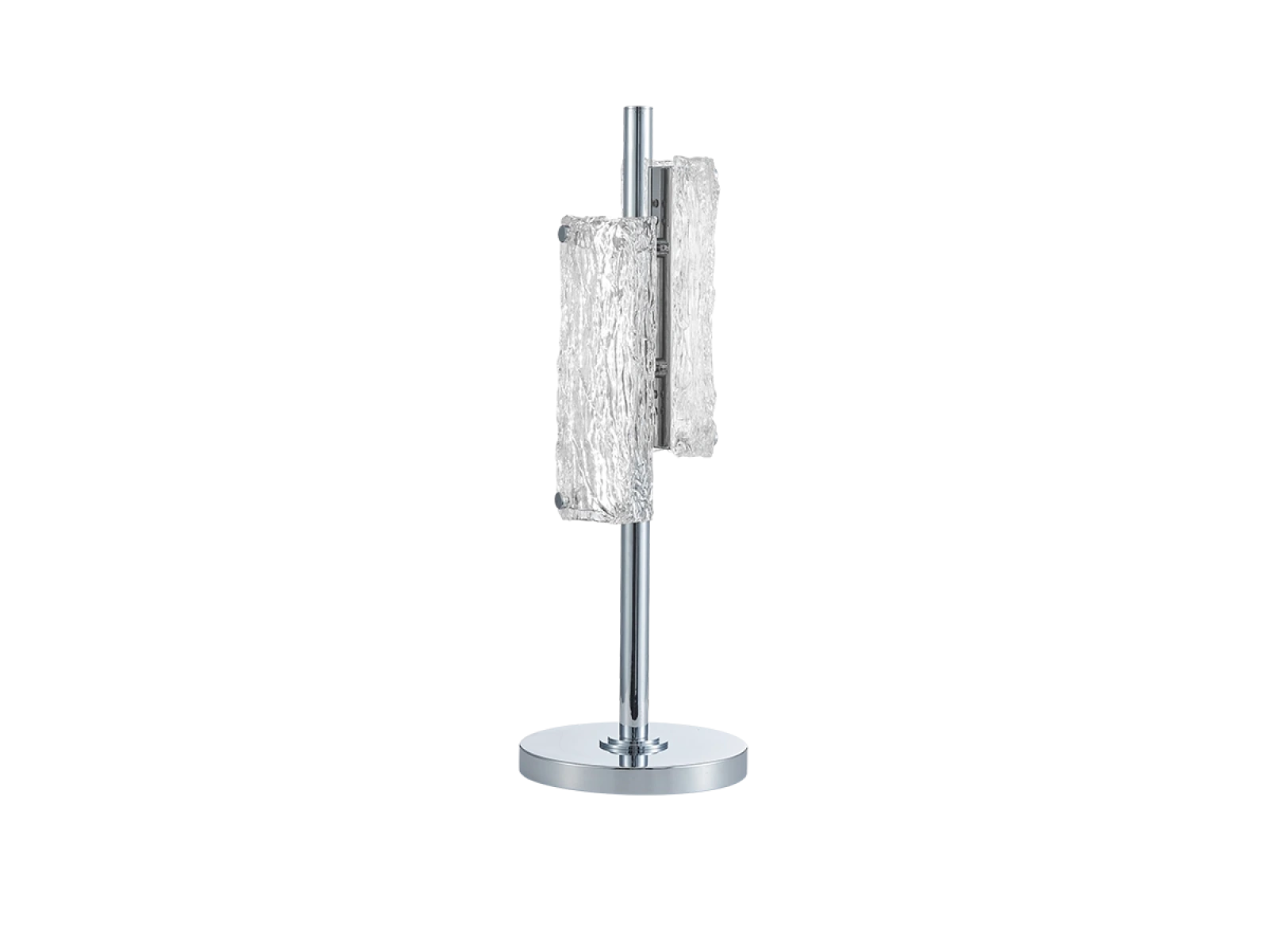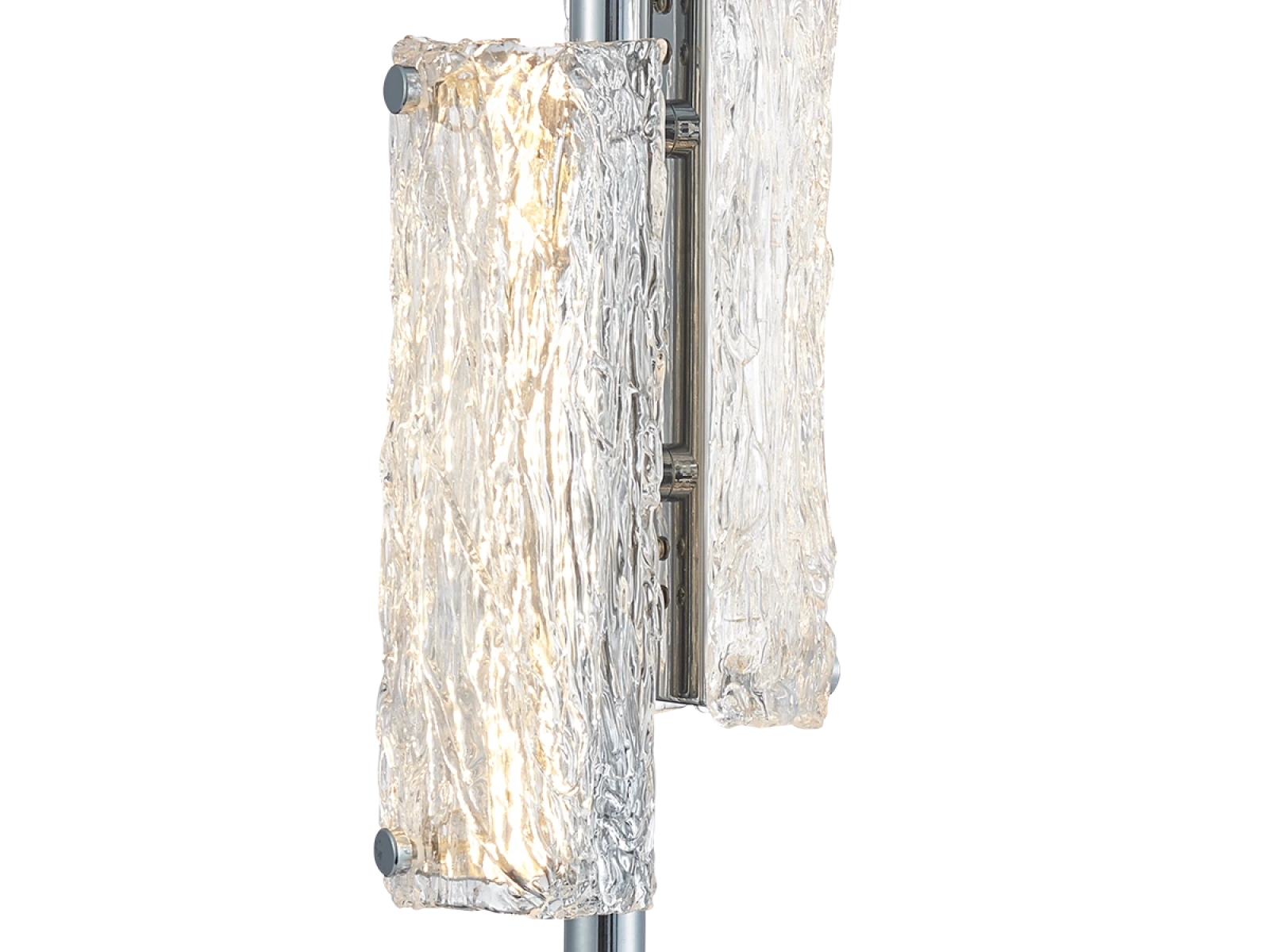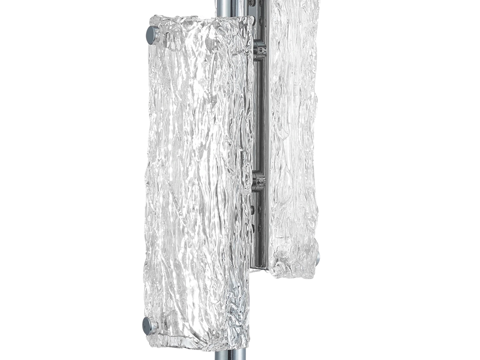Die Leuchte ist aus hochwertigem, verchromtem Edelstahl gefertigt , was für eine lange Lebensdauer, Stabilität und ein luxuriöses Erscheinungsbild sorgt. Die Glaselemente mit einer strukturierten , rindenähnlichen Oberfläche sorgen für eine gleichmäßige und angenehme Lichtstreuung.