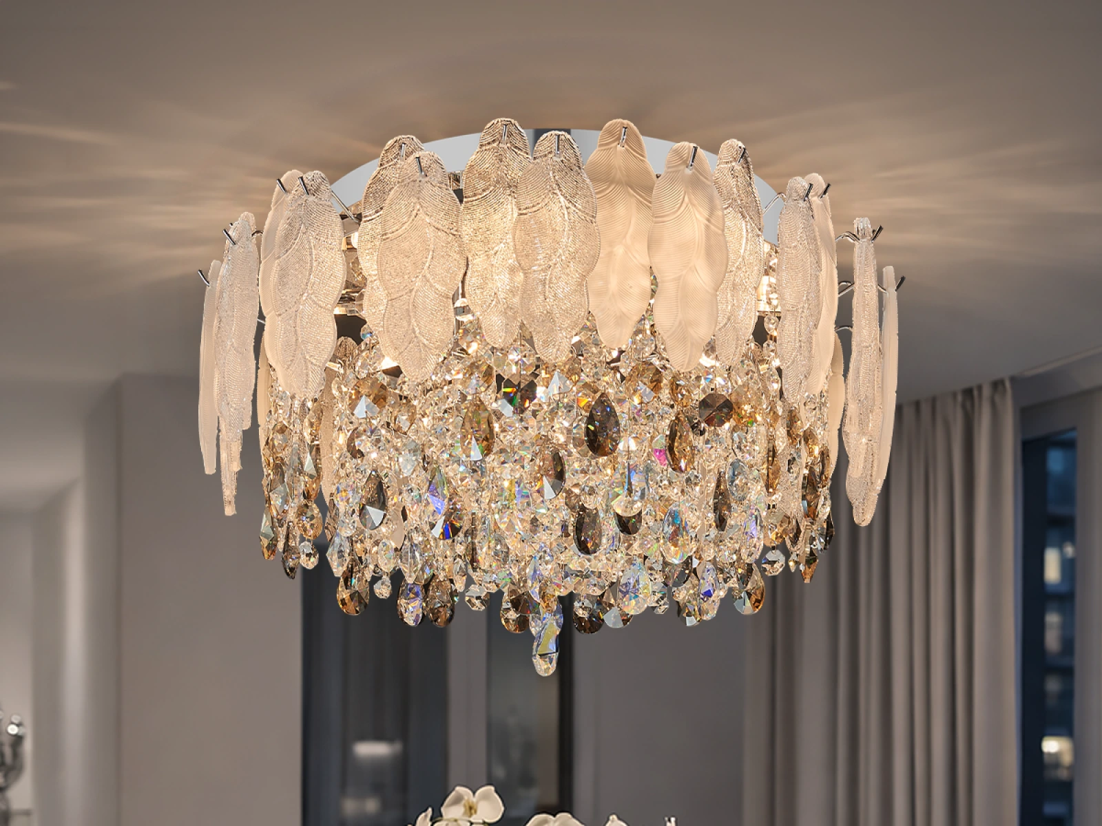 Die Deckenleuchte GURU von VIZARDI ist eine harmonische Kombination aus Eleganz, subtilem Luxus und modernem Design. Dank ihrer markanten und dennoch ausgewogenen Erscheinung fügt sie sich ganz natürlich in Wohn-, Ess-, Schlaf- und repräsentative Räume ein und schafft dort eine einladende und stilvolle Atmosphäre.