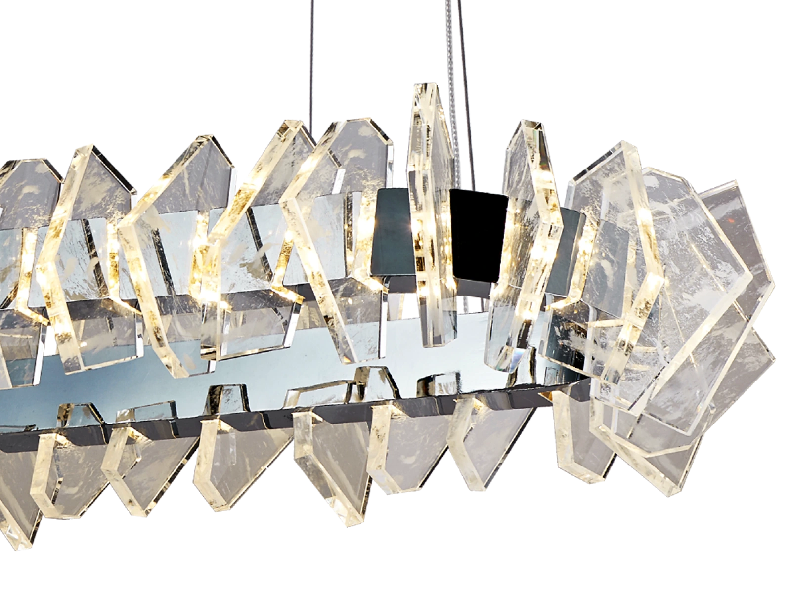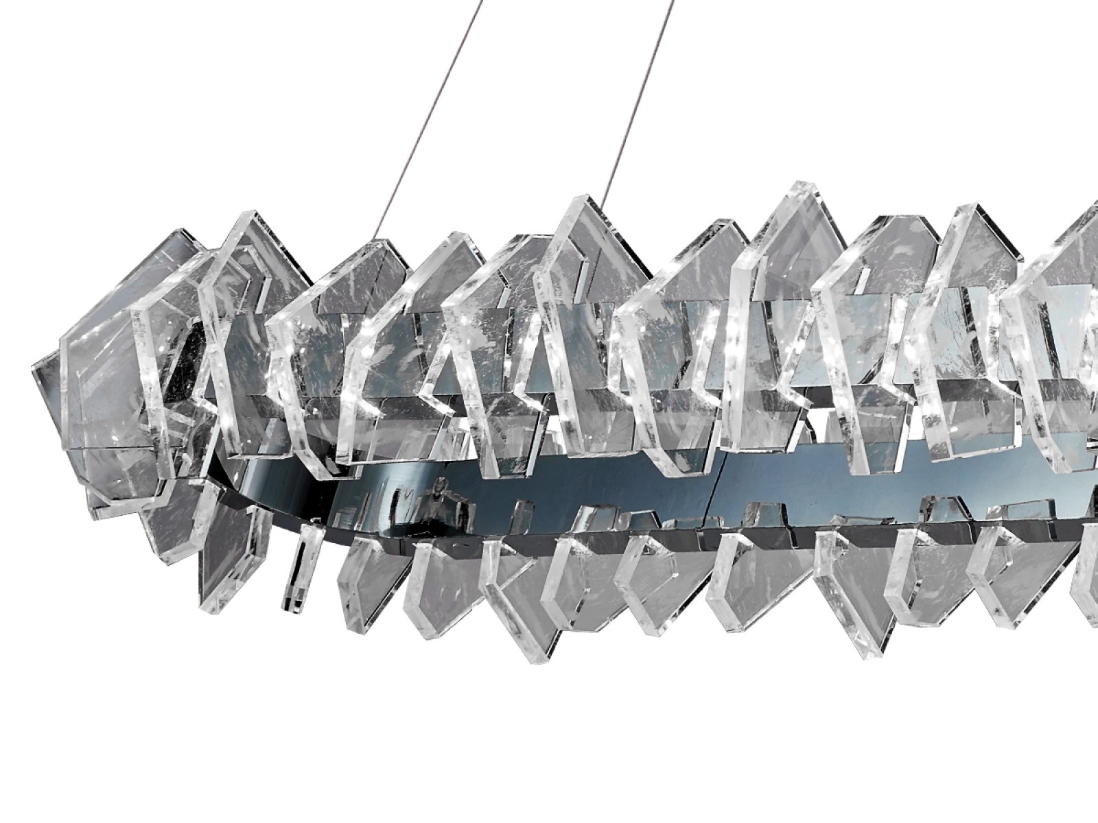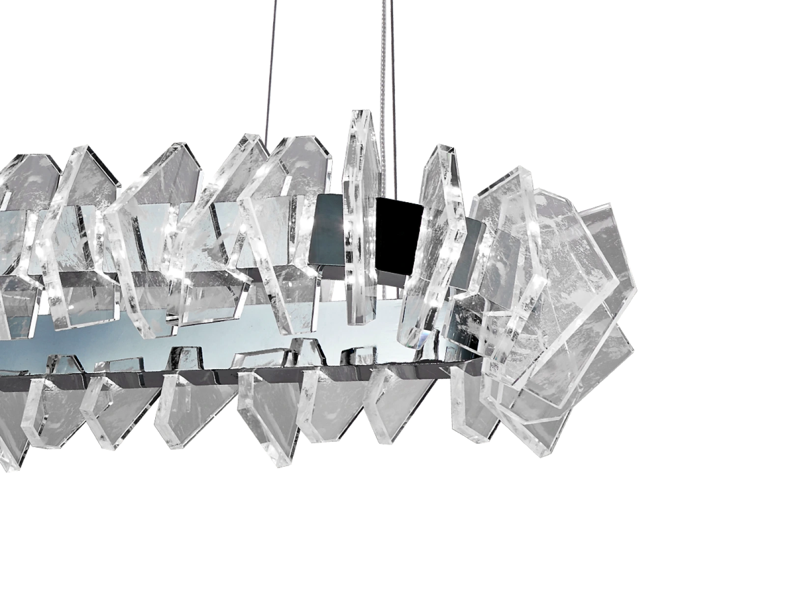 Die Konstruktion ist aus hochwertigem, verchromtem Stahl gefertigt und wird durch originelle, präzise geschliffene Kristallelemente ergänzt, die eine intensive Lichtbrechung und -reflexion gewährleisten. Das Ergebnis ist ein luxuriöses Lichtambiente mit einem unverwechselbaren dekorativen Effekt, der den Charakter sowohl moderner als auch repräsentativer Innenräume unterstreicht.