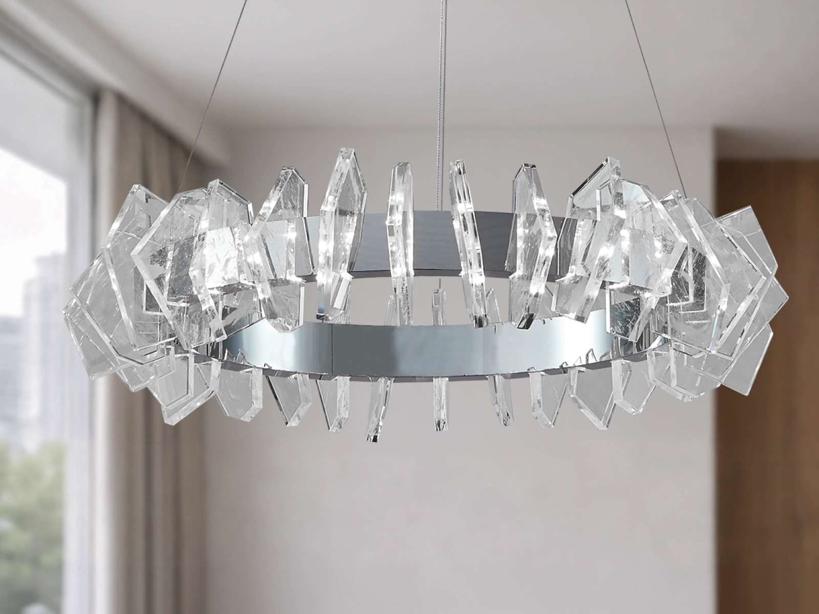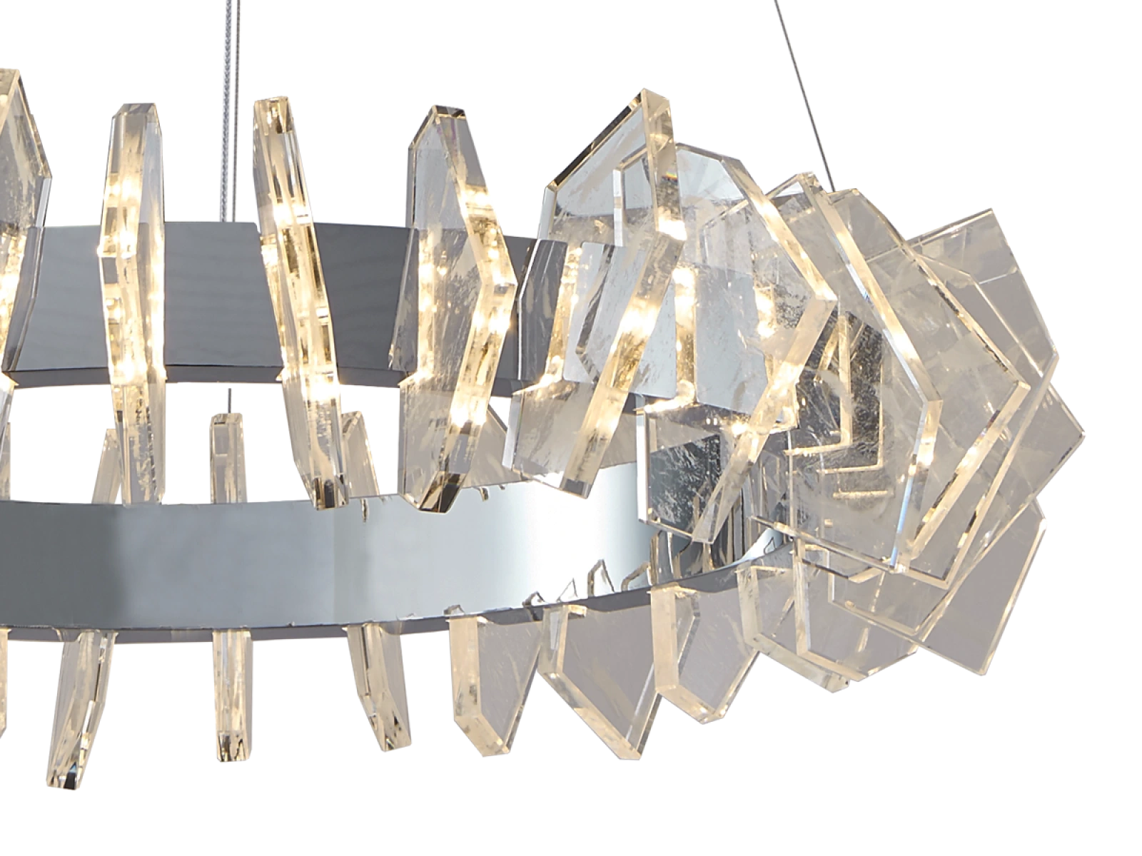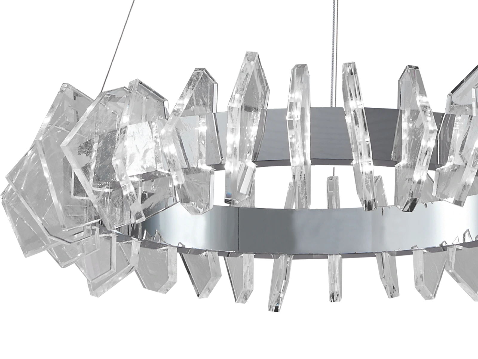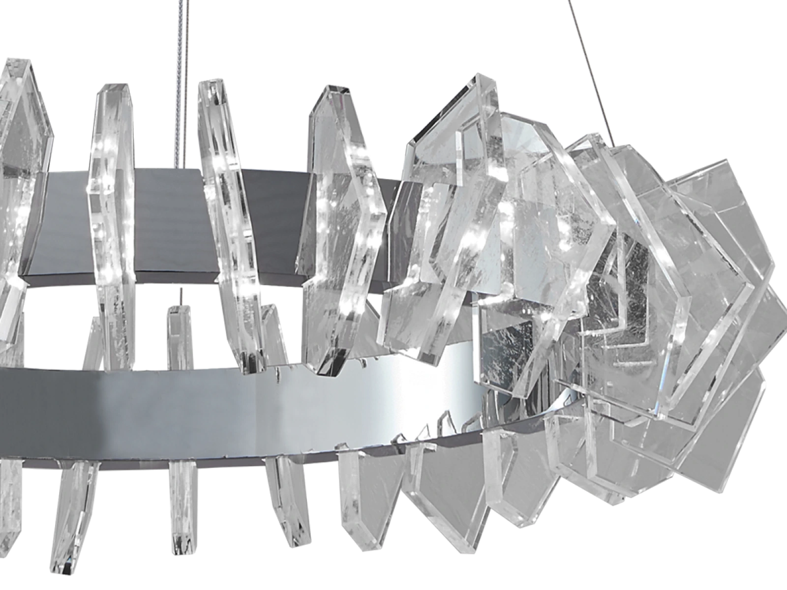 Die Konstruktion ist aus hochwertigem, verchromtem Stahl gefertigt und wird durch originelle, präzise geschliffene Kristallelemente ergänzt, die eine intensive Lichtbrechung und -reflexion gewährleisten. Das Ergebnis ist ein luxuriöses Lichtambiente mit einem unverwechselbaren dekorativen Effekt, der den Charakter sowohl moderner als auch repräsentativer Innenräume unterstreicht.