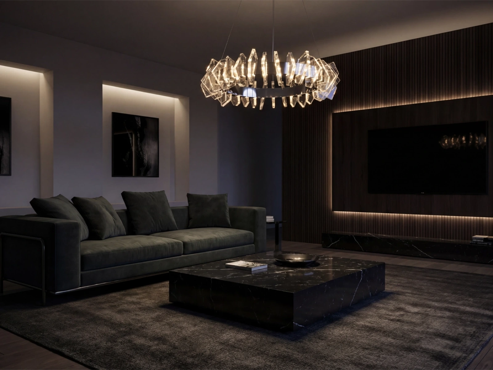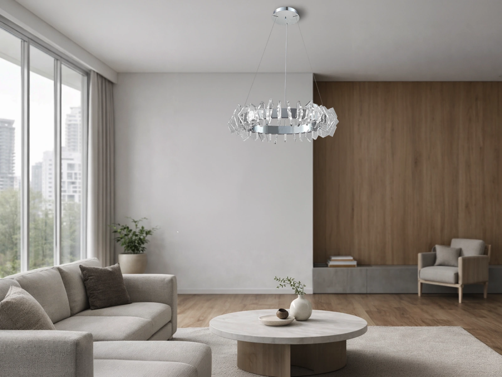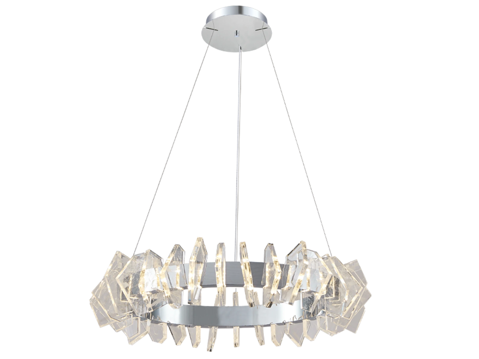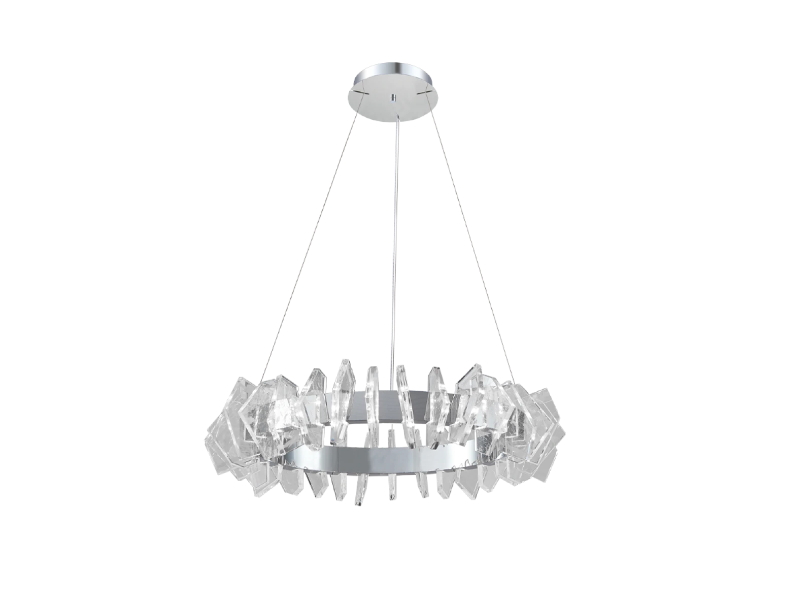 Die Konstruktion ist aus hochwertigem, verchromtem Stahl gefertigt und wird durch originelle, präzise geschliffene Kristallelemente ergänzt, die eine intensive Lichtbrechung und -reflexion gewährleisten. Das Ergebnis ist ein luxuriöses Lichtambiente mit einem unverwechselbaren dekorativen Effekt, der den Charakter sowohl moderner als auch repräsentativer Innenräume unterstreicht.