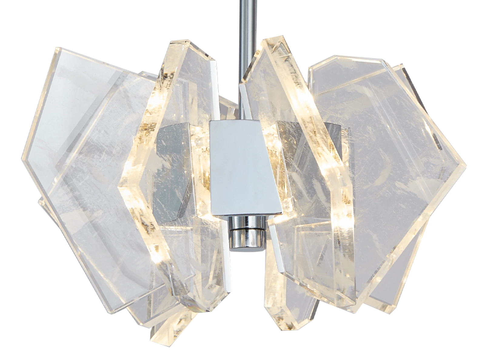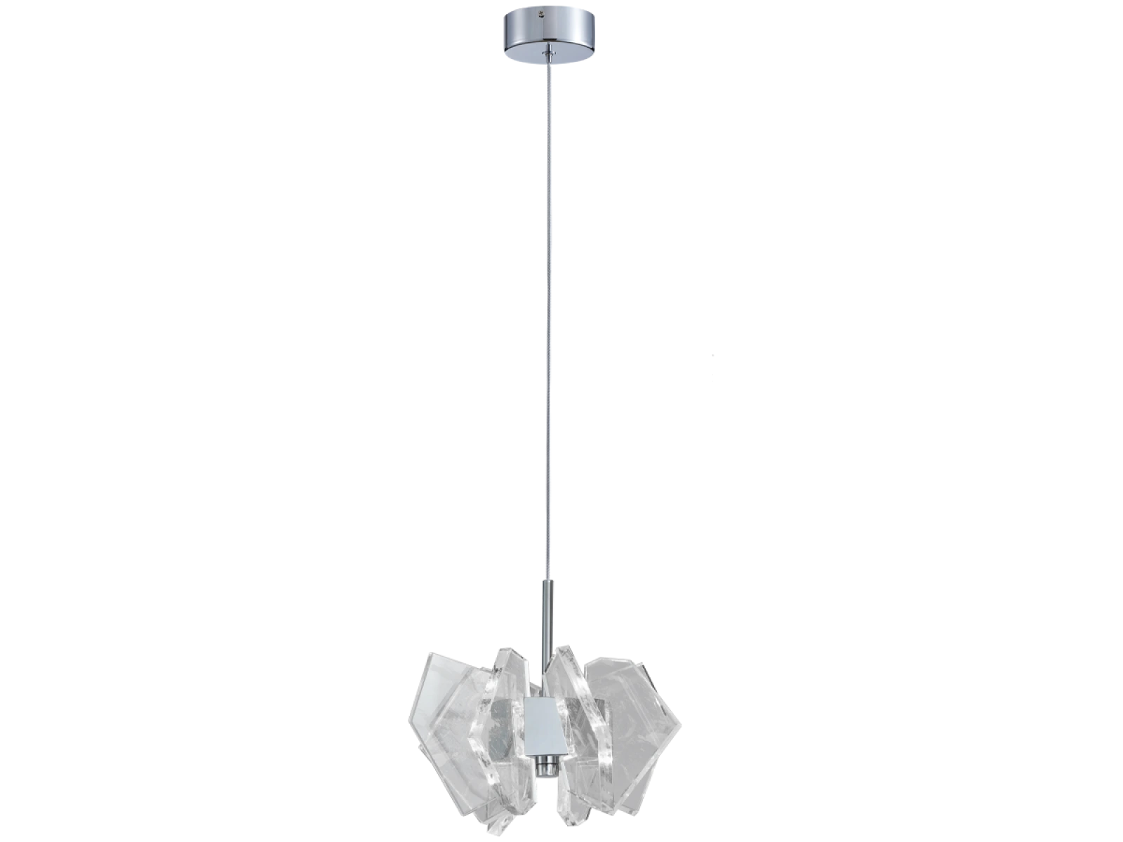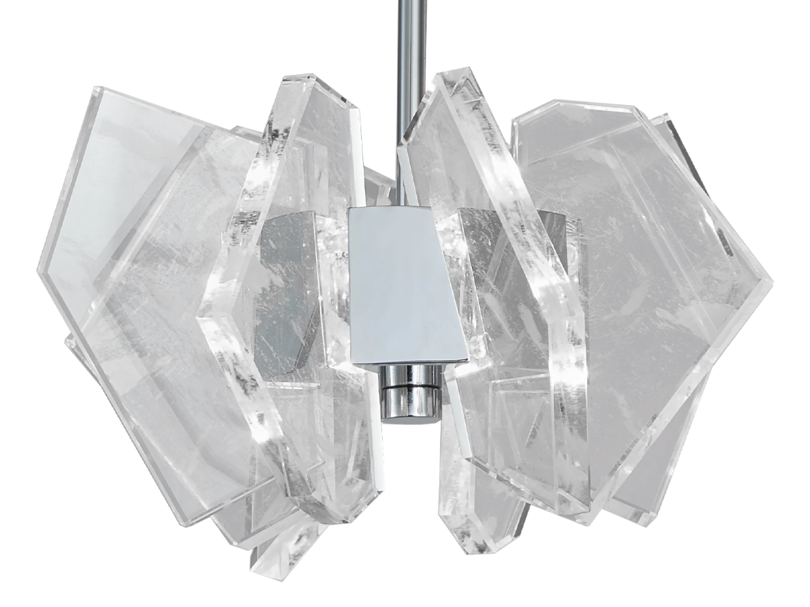 Die Konstruktion ist aus hochwertigem, verchromtem Stahl gefertigt und wird durch originelle, präzise geschliffene Kristallelemente ergänzt, die eine intensive Lichtbrechung und -reflexion gewährleisten. Das Ergebnis ist ein luxuriöses Lichtambiente mit einem unverwechselbaren dekorativen Effekt, der den Charakter sowohl moderner als auch repräsentativer Innenräume unterstreicht.
