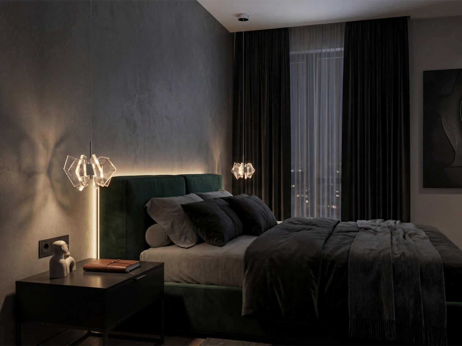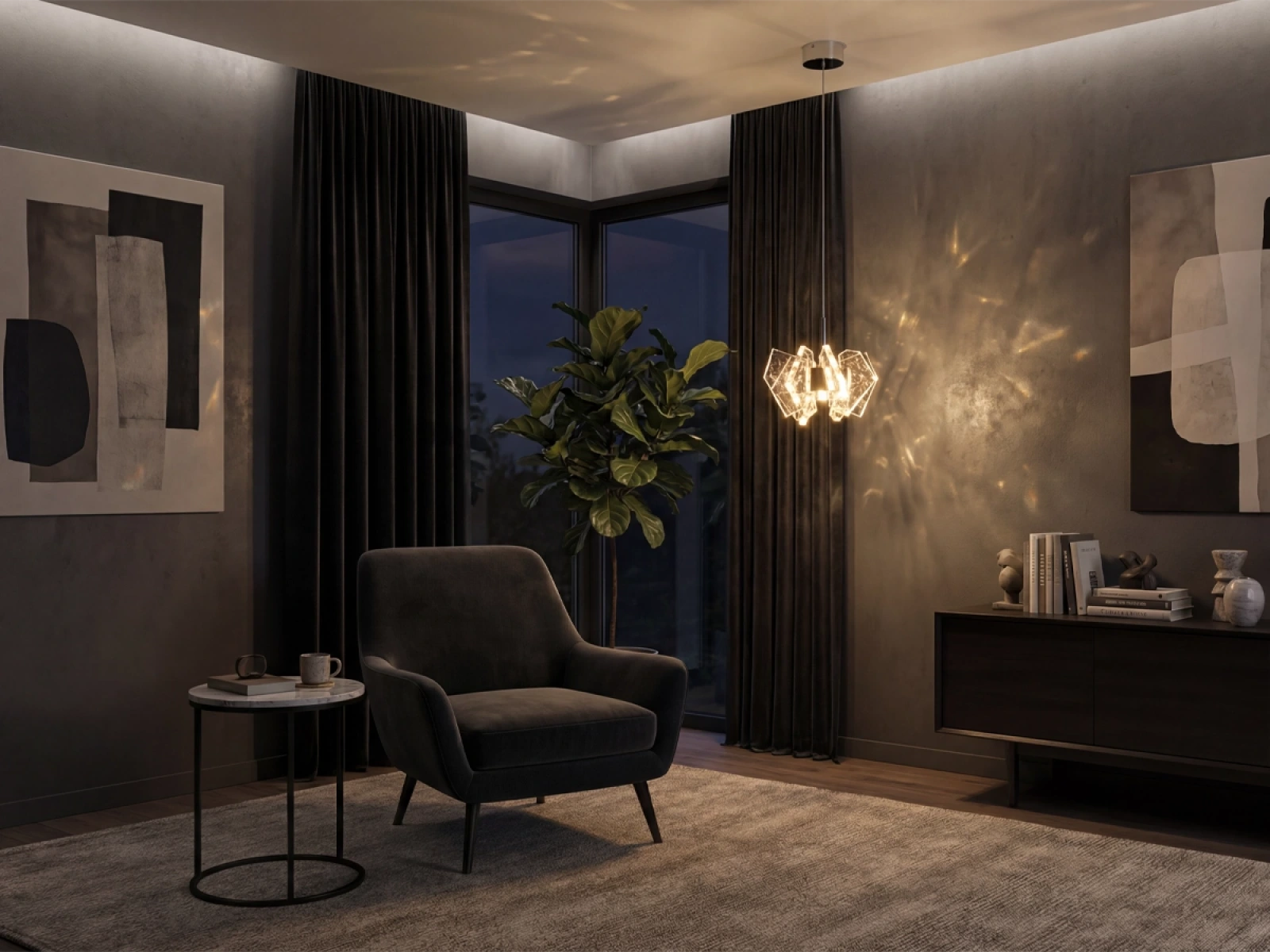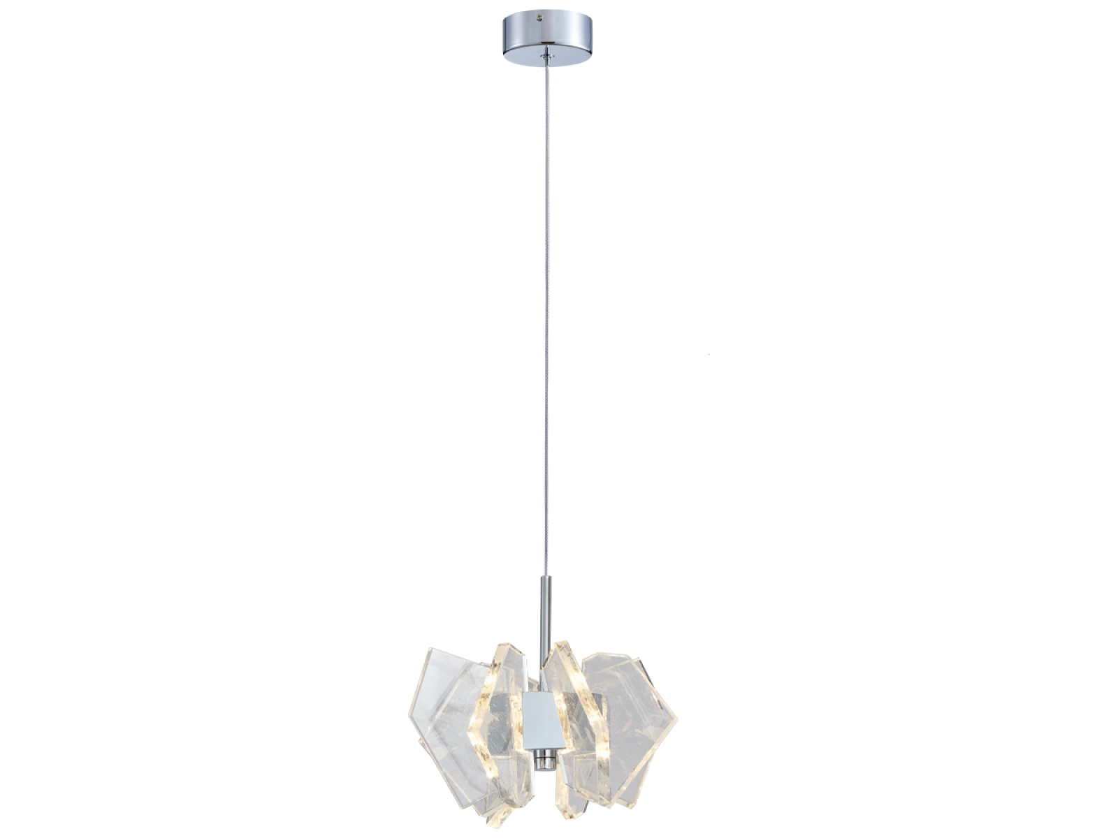 Die Konstruktion ist aus hochwertigem, verchromtem Stahl gefertigt und wird durch originelle, präzise geschliffene Kristallelemente ergänzt, die eine intensive Lichtbrechung und -reflexion gewährleisten. Das Ergebnis ist ein luxuriöses Lichtambiente mit einem unverwechselbaren dekorativen Effekt, der den Charakter sowohl moderner als auch repräsentativer Innenräume unterstreicht.