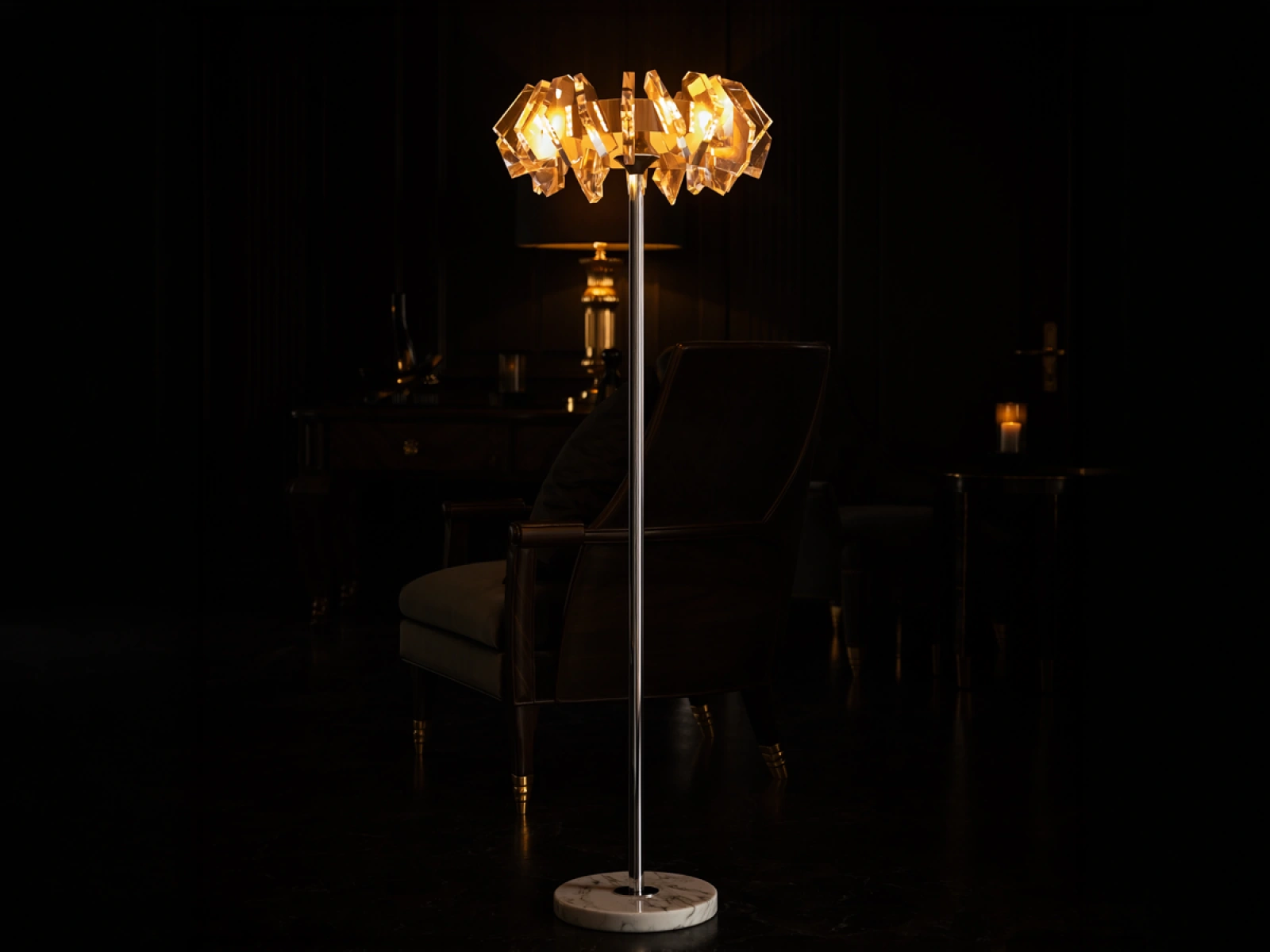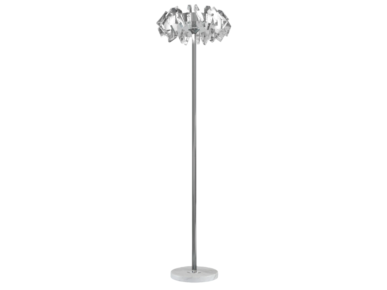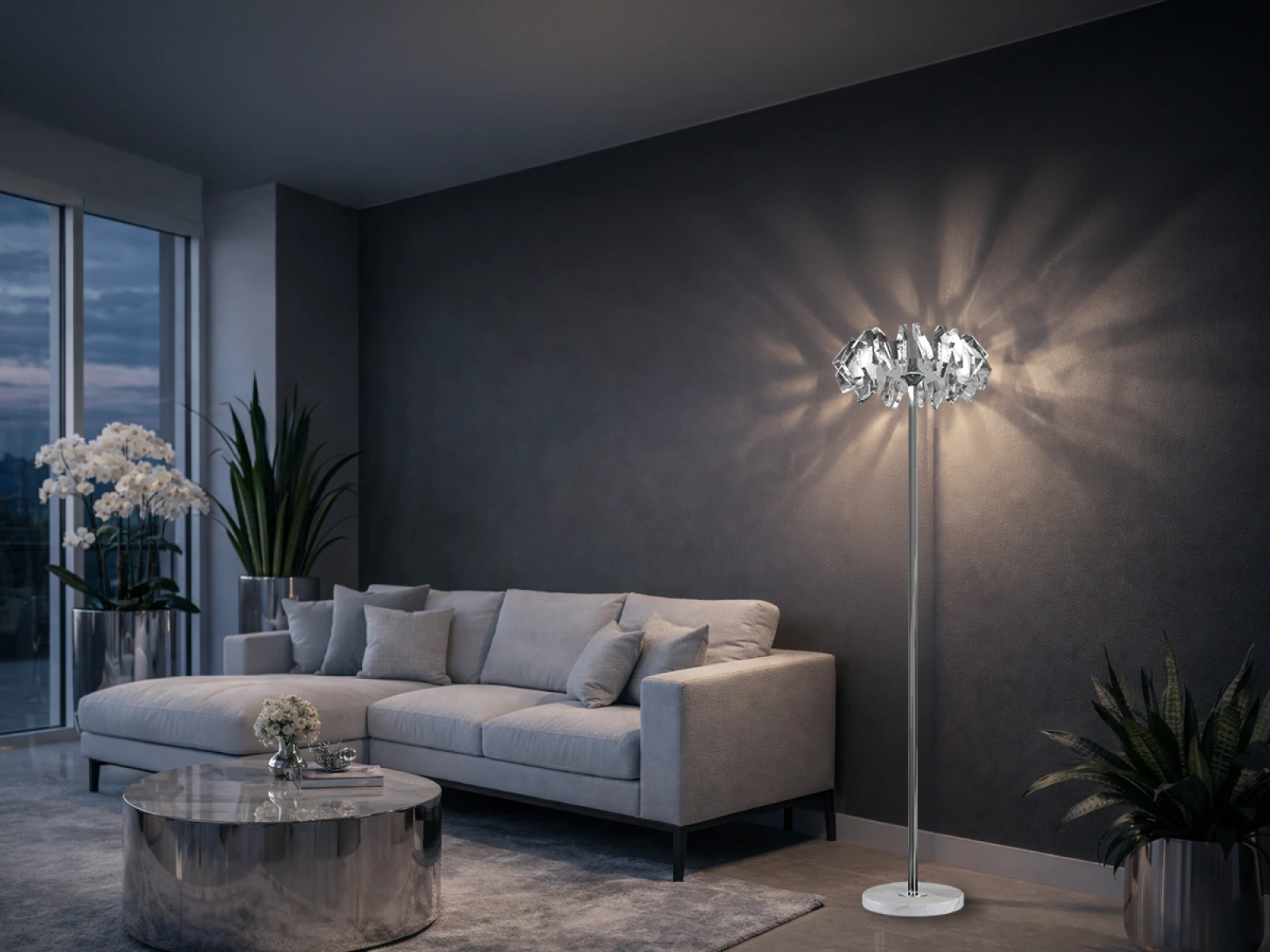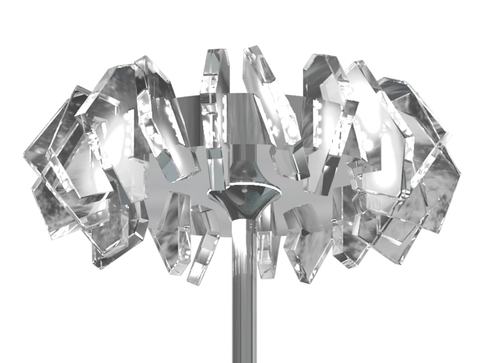 Die Konstruktion ist aus hochwertigem, verchromtem Stahl gefertigt und wird durch originelle, präzise geschliffene Kristallelemente ergänzt, die eine intensive Lichtbrechung und -reflexion gewährleisten. Das Ergebnis ist ein luxuriöses Lichtambiente mit einem unverwechselbaren dekorativen Effekt, der den Charakter sowohl moderner als auch repräsentativer Innenräume unterstreicht.